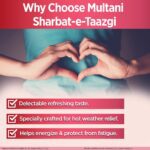 Perfect Additives For Mocktails – Multani Sharbat-E-Tazgi is perfect additive for to syrup for Milkshake , Firni, Faluda, Ice Cream, Thandai Syrup, Khus Sharbat, Rose Milk Syrup, Khus Sharbat, Rose Syrup, Paan, Badam Shake And Kulfi To Get An Extra Zing. It has nutrients which make your preparations tasty and healthy. Useful as energizer especially In Summer and also Useful In Heat Stroke.